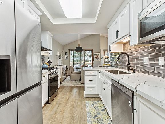 Tired of dated condos? A little slice of heaven awaits you in this remodeled one level with stunning view of Blue Spruce trees from the deck. Light and bright upper unit with VAULTED ceilings and gas fireplace. Seller lovingly remodeled w/Engineered WOOD floors (not vinyl) and 4-inch baseboards, gutted, white kitchen w/pull outs in pantry, recycling area and stainless appliances, permitted gas line installed for gas stove chefs! Gorgeous Spanish backsplash and QUARTZ countertops in kitchen plus both baths. Lovely primary bath completed in Dec 2024, what every buyer wants off the primary bedroom a walk-in shower, 12 x 24 tiles, sitting area and double sized shampoo shelf. Double closets and built-in shelves in primary too. Thousands spent to make this your forever home. New stacked washer and dryer included! Truly a fun place to live in this 55+ with access to the pool, discount golf, pickleball and fun activities including an art show. Upper unit has approx. 8 steps up. Single car garage with room for all those extras. Secure building entry. The grounds are professionally groomed. Move in and enjoy this peaceful and quiet setting.
