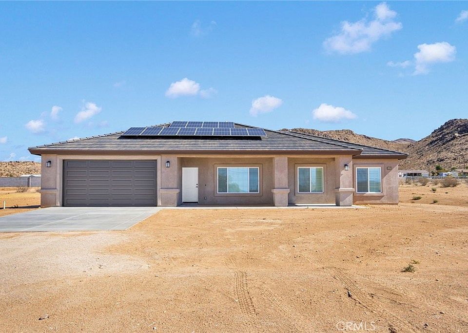 Welcome to this beautifully designed single-story home located in the city of Apple Valley. This new construction home offers a split floor plan with 4-bedrooms and 2-bathrooms. Step inside to find a bright open-concept layout with high ceilings, can lighting and upgraded flooring through-out the home. Kitchen offers quartz countertops, stainless steel appliances, sleek cabinetry and a pantry. The primary master suite offers ample space with an en-suite bathroom and a spacious closet. Outside enjoy a covered patio and beautiful views of the high desert. Home sits on over half an acre that provides plenty of space for privacy, RV access, off-road vehicles and horses. This home offers a 2-car garage, paid off solar, indoor laundry area, ceiling fans and upgraded window coverings through-out. Come see 15575 Desert Star Road!