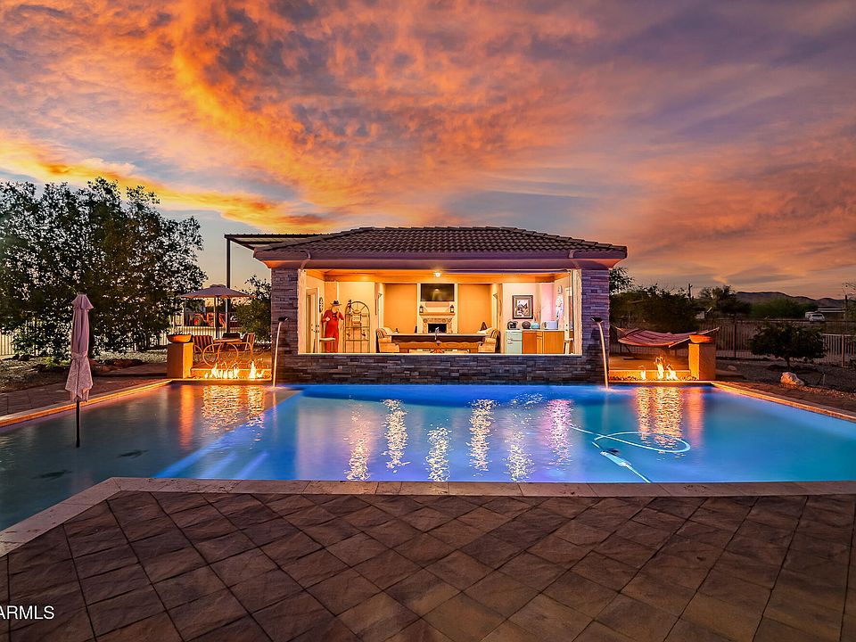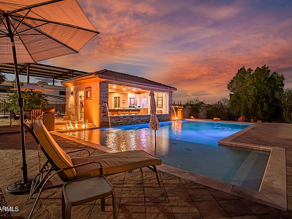 Outdoors, create memories in your own resort-style oasis. A newly upgraded 20x50 Pebble Tec pool with glass-beaded tile, Baja step, new LED lighting, a variable speed pump and dual propane fire pits sets the stage for unforgettable memories. The pool house with wood burning fireplace, TV, pool table and kitchenette, makes entertaining top notch and adds an extra layer of versatility and fun. The commanding flagpole in the circular driveway welcomes your guests in style. Equestrians will appreciate the irrigated arena, two horse stalls with water, and mature shade and fruit trees dotting the landscape. Full irrigation in front and back ensures lush greenery year-round, complemented by striking exterior LED lighting that brings the property to life after sunset.