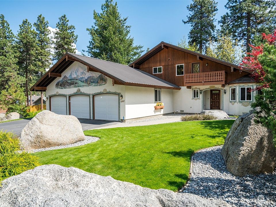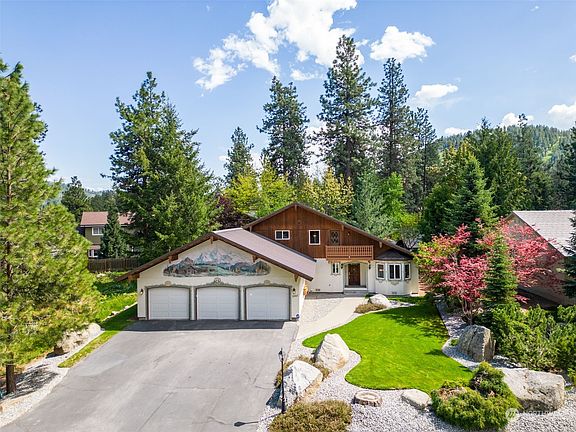 Drive up to this custom-built 4 bedroom 2.5 bath Bavarian style home located in one of Leavenworth’s most desirable neighborhoods on a very peaceful street. You will be greeted by a beautiful Alpine mural over a huge 3-car garage. Open the front door to inviting custom slate floors in the foyer. This freshly painted house is great for entertaining. The kitchen is beautifully detailed with custom cabinets offering lots of storage & hand carved floral woodwork. Large living room with gas fireplace, formal dining room, sunken family room & beautiful primary bedroom suite all on main level. Lots of outside decks to take advantage of the views. Just a short walk to town & a huge benefit of a lovely community beach on the Wenatchee River!