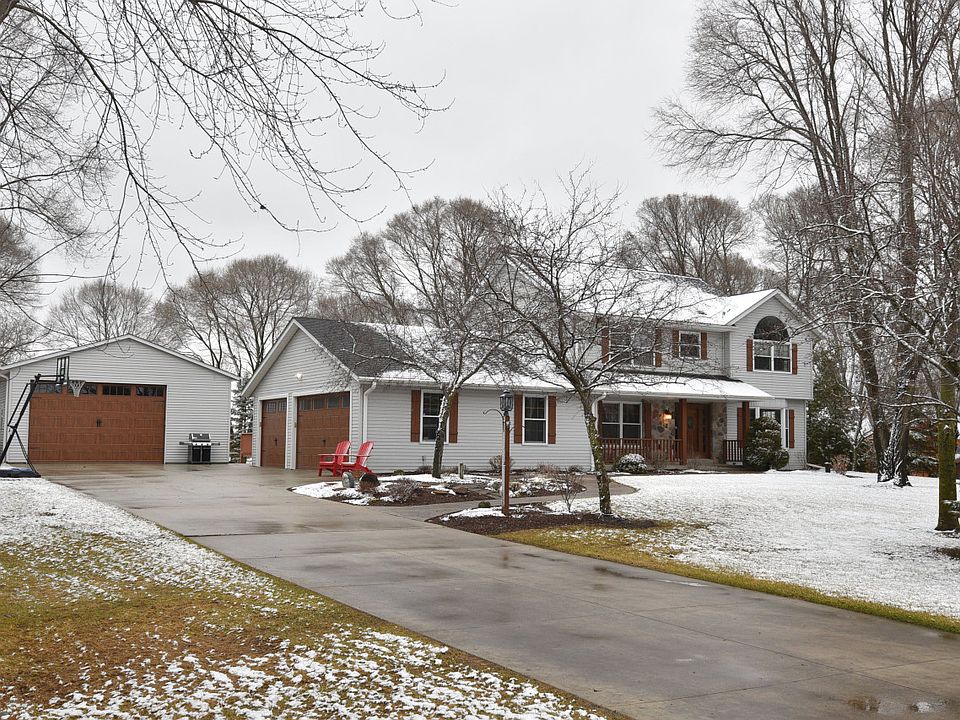 Beautifully built, tastefully updated and decorated, well cared for, spotlessly clean home on 1.68 private country acres. 6 total garage spots! 3 car attached and 3 car detached garage plus a large shed. 4 bedrooms, 2.5 bathrooms, plus family and living room with gas fireplace. Beautiful updated granite and corian countertops, updated light and plumbing fixtures, updated kitchen and bathrooms. Low maintenance stone, vinyl and aluminum exterior. Huge unfinished lower level or for entertaining and storage! Private huge deck and well maintained swimming pool with mature trees, shrubs and flowers custom sidewalks and beautiful details. Includes stainless steel and black oven/stove with glass cooktop, refrigerator, dishwasher and microwave range hood. Beautiful tile, wood and carpet flooring.