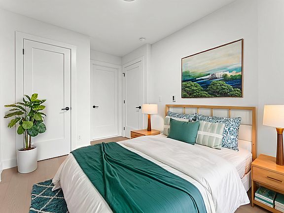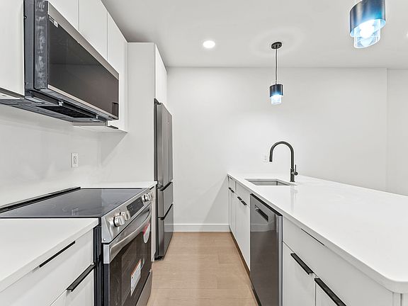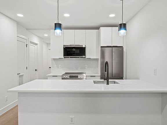 The open kitchen is a chef's dream, featuring custom cabinetry, quartz countertops, and premium stainless-steel appliances. Spacious bedrooms offer ample closet space, while the two stylish bathrooms boast high-end fixtures and contemporary tilework.