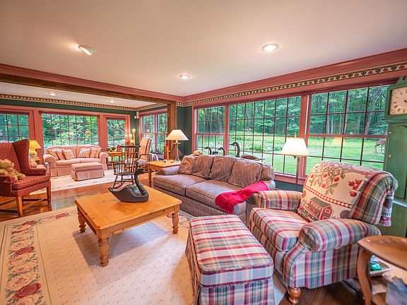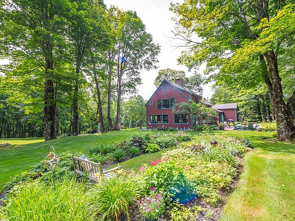 Experience a rare combination of lake, village, and ski, proximity in this stunning country estate. Located just down from Lake Raponda, outside the village of Wilmington, and a short drive to Mount Snow, on a quiet country road enshrouded by beautiful maple trees, sits this meticulously maintained country cape farmhouse, lovingly updated by the current owners. Wander up the serpentine drive and you'll immediately notice the beautiful grounds, restored stone walls, exposed natural ledge, and perennial gardens. At the home you feel perfectly serene, without having too much to maintain, but with utter privacy thanks to the adjacent buffer of land trust protected property. Inside you are treated to a lovely open concept floor plan with tremendous natural light and large oversized windows. There is an updated kitchen with Corian counters, island, walk in pantry, and breakfast table, a bright dining area, which leads into the cozy sittings areas with wide pine floors, natural exposed beams, updated gas fireplace, fully rebuilt chimney, and exposed brick hearth. Upstairs is a large primary suite with walk in closet and renovated tiled bath, two spacious guest rooms and a full guest bath, and additional finished loft ideal for overflow sleeping, loft space, or play area. There is also a large mudroom entry with ample storage, attached 2 car oversized garage, dual storage/garden shed, screened gazebo for outdoor dining, stone patio, water feature, and the list goes on.