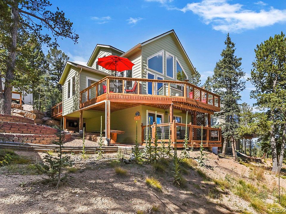 THIS ABSOLUTELY STUNNING MOUNTAIN CHALET IS TURN KEY. Walk up to the front door via the inviting front porch and notice the new storm door. Walking through the front door, you will instantly be struck by the views in front of you. The main floor has beautiful ceramic tile that looks like wood. The soaring pine ceilings add so much to this space. The stone fireplace makes the living room so cozy and all of the extra large window bring the natural light in and frame the amazing view. Walk out to the enormous wrap around deck to take in the mountain views. This home has the WOW factor through out. There are 2 decks and a large front porch. Walk into the kitchen with hickory cabinets, tile counters, tile backsplash, and new SS appliances.This home has a great layout with the master bedroom on the main level. The master has new engineered wood floors along with the vaulted pine tongue in groove ceiling. The master bath is right off the bedroom with a beautiful tiled shower/bath and hickory cabinets. Don’t miss the spacious loft which is large enough for another bedroom or office. Downstairs has 2 large bedrooms with a great jack and Jill bathroom in between them. The laundry and storage room is also downstairs. One of the lower bedrooms has a walk out to a lower, covered deck. Additional parking along with landscaping has been added and a 12 x 10 storage shed is also close to the house. 35k in upgrades in just the past 3 years! Minutes away from hiking, fishing, and OHV trails. 40 minutes to Colorado Springs, 2 hours to Breckenridge. Abundant wildlife can be seen such as deer, bear, turkeys, fox, and chipmunks. Don’t miss seeing this one!