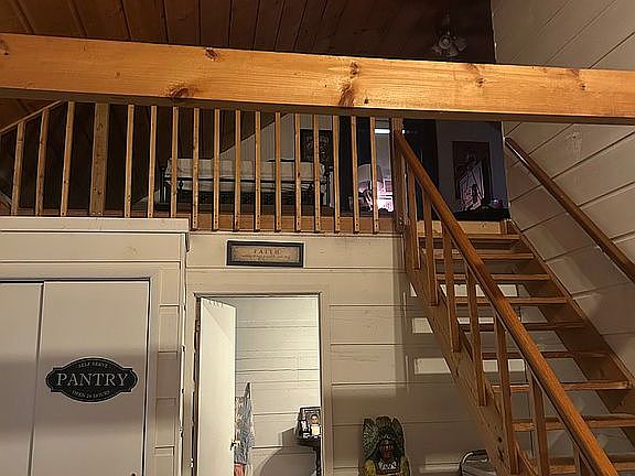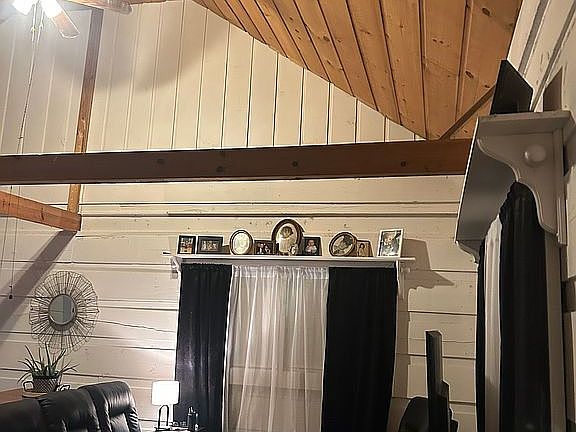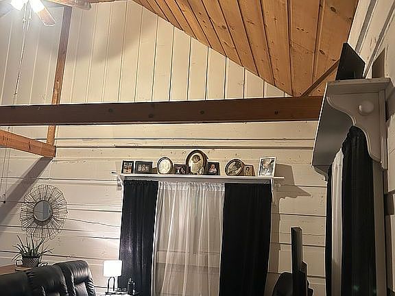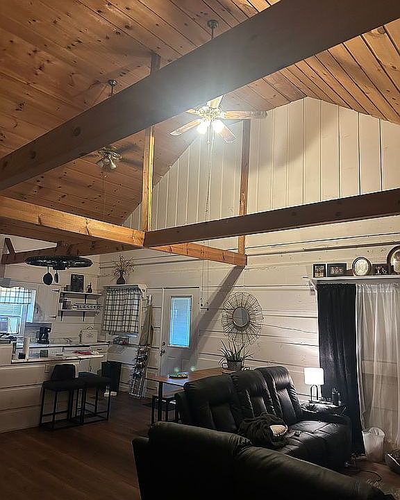 Log home with big porch and 4+acres with creek running through the land. A big work shop pictured with power and water. New roof on shop building in 2021. Fenced pasture for farm animals with access to creek. Shed built for animal to feed and get in from weather. Home has new metal roof in 2016. New kitchen counter tops. New LVP flooring in all upper levels. Main bathroom has added stackable washer and dryers to keep from having to carry clothes down stairs.  Full basement with wood heater for back up heat if power goes out in winter. Kitchenette,  laundry room, room for little den and bed downstairs or rec room. Room for tiny farm, gardens whatever needed. Home has city water and does have spectrum fiber optic internet and satellite