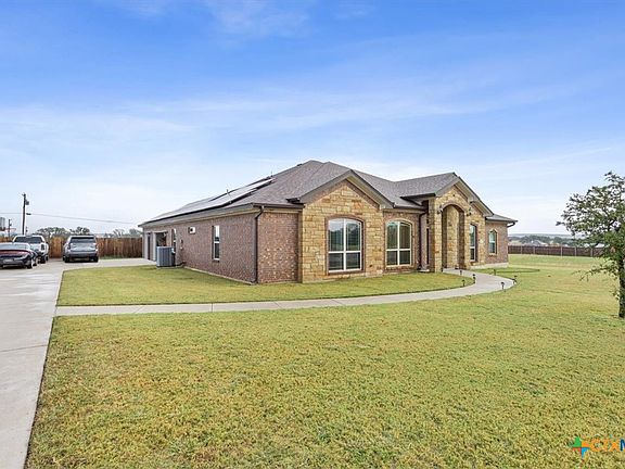 Stunning 2,395 sq ft home on .8 acres just outside of town! This beautifully crafted home offers the perfect blend of comfort, style, and space. Step inside to find gorgeous tile flooring throughout the main living areas and custom trim work that adds charm and character at every turn. The spacious living room features a tray ceiling and a striking rock fireplace. The kitchen is a standout with custom cabinets, granite countertops, and plenty of storage. The master suite is a true retreat with custom ceiling trim, a double vanity, a large soaking tub, and a walk-in shower. Guest bedrooms are generously sized, offering plenty of room for family or visitors. Enjoy outdoor living on the expansive covered back porch, overlooking a large yard enclosed with a wooden privacy fence. Additional features include solar panels for energy efficiency and cost savings.