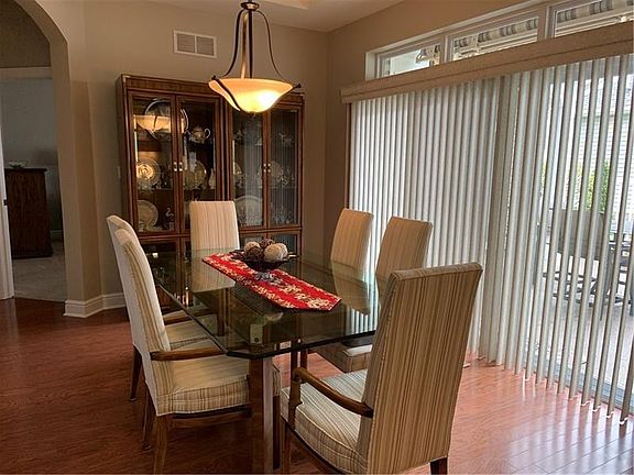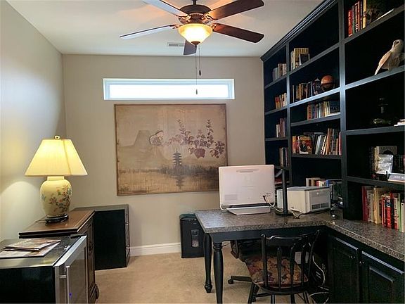 Beautiful patio style home with lots of upgrades. Built in custom bookshelves and desk with glass doors in den. Cherry cabinets in kitchen, ss appliances, under counter lighting, pantry, tile backsplash and roomy kitchen island. Fenced in patio, with retractable awning. Large master with adjoining sun room. Stunning living room with built in speakers and surround sound. Bathrooms have high rise toilets and countertops. Heated 2 car garage. Extra refrigerator in garage is included.