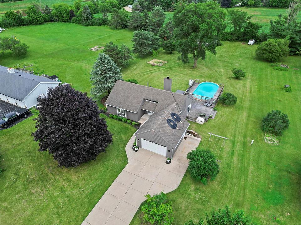 Stunning 4 bed 3 bath open concept Ranch Home on over 1 acre w/ new ext paint, pool, outbuilding & updated interior. Main floor feat fresh paint, new LVP flooring, carpet, new light fixtures & hardware + main floor laundry. Living room feat fireplace, vaulted ceilings & skylights. Kitchen offers granite counters, SS appliances, new hardware & light fixtures. Dining room floods w/ natural light from dual sliding glass doors. Primary Bed offers full bath w/ jetted tub & walk-in shower. Updated 2nd main floor bath feat new walk-in shower. Fully finished LL offers large rec room, new carpet, recessed lighting, 3rd full bath & 4th bed perfect for guests or home office. 854 sq ft heated outbuilding w/ 100 AMP electrical & 220v ideal for car enthusiasts. Some Photos Virtual Staged