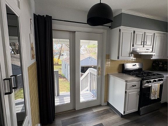 Ready to move in updated Bungalow. From the front door you enter an enclosed front porch that leads into the living room with hardwood floors, ceiling fan and two coat closets. Both bedrooms also feature hardwood floors and ceiling fans. The bathroom has a new vanity, mirrored medicine cabinet, and new LVT flooring. There is a linen closet in the hallway. The updated eat-in kitchen features white cabinets, new stainless steel appliances, new LVT flooring, new stainless steel sink, new faucet, built-in china cabinet and a sliding glass door leads you out to an amazing deck. The rear yard is fenced. There is a one car detached garage with new concrete floor and electric. The basement features a finished Recreation Room with new carpet. The furnace was installed in 2017. New Water Heater. New Electric service. New roof on the house.