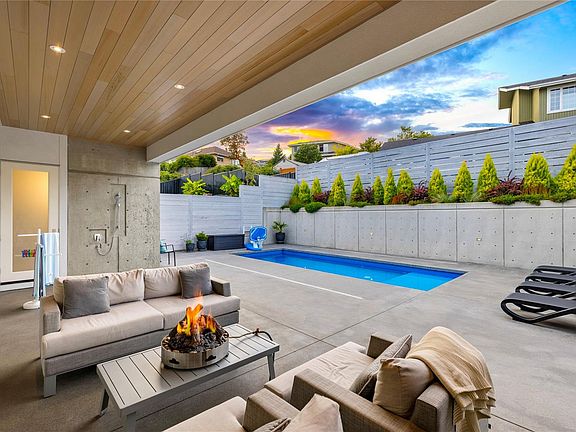This custom built home enjoys a southern exposure and boasts an array of luxurious features. The expansive living area seamlessly blends with the outdoors through a 20’ sliding door leading to a private fenced yard complete with a covered patio and a 25x10 heated in-ground pool. Exterior aluminum stairs lead to an impressive 800 sqft rooftop deck with stunning ocean views. Inside, the gourmet kitchen is a chef’s dream with double islands, a Miele Appliance package, and a convenient butler’s kitchen. The generous primary bedroom features a stunning 5pc ensuite with dual vanity, water closet, freestanding tub, glass shower, and a spacious walk-in closet. Throughout the home, you'll find quartz countertops, vaulted ceilings, architectural concrete interior walls, a 72” linear fireplace, custom wood open riser stairs, and engineered oak flooring. There are also two sets of laundry facilities for added convenience. All measurements are approximate and should be independently verified.