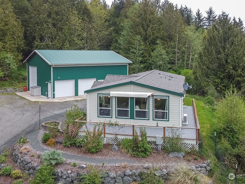 Modern, open concept home with beautiful mountain views is placed for maximum privacy on 4.35 acres. The primary suite has a generous sized bedroom, walk-in closet, and a bath with large shower and double vanity. In addition to the second bedroom, there is an office with lots of light from the large window. An outbuilding of 1,535 sf has room for autos, workshop( w/220 power), storage and an RV with 3-50 amp electrical and 2 dump stations, in addition to a 3/4 bathroom, plumbed for a 2nd upstairs, 3 outdoor frost-free hydrants. A circular drive makes it easy to maneuver your RV, trailer or boat. Beautiful horticultural specimens are placed in a terraced garden. Home & shop wired for generator w/transfer switch.
