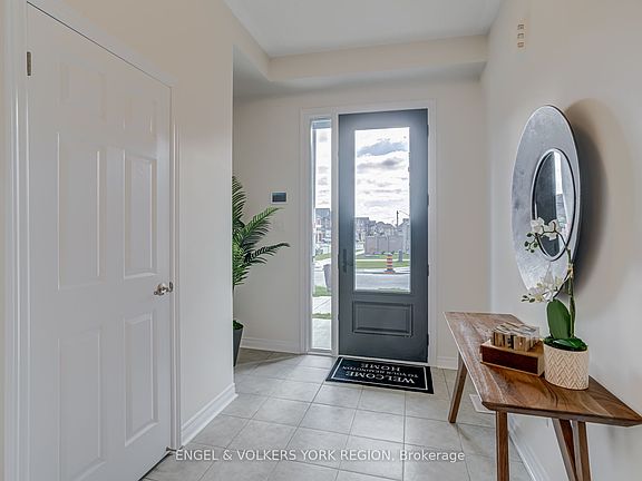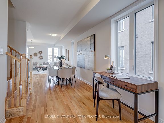 Welcome to this new elegant freehold luxury townhome, crafted by the acclaimed Remington Group. This end unit offers 1,933 square feet of beautifully designed living space that feels bright, open, and inviting from the moment you step inside. Expansive side windows flood the home with natural light, while 9 foot ceilings on both levels create an airy and elevated feel. The kitchen blends form and function with granite countertops, tall cabinetry, a central island, and a sleek stainless steel hood fan. Hardwood floors flow through the main level, adding warmth and timeless character. Upstairs, the primary bedroom is spacious and thoughtfully designed with double closets and a freestanding tub in the ensuite, offering a touch of everyday luxury. Each bedroom has a walk in closet, while the primary offers his and hers, creating a beautifully organized and comfortable living space. The backyard offers peaceful green space, perfect for slow mornings, family gatherings, or quiet evenings. This location places you steps from the Aaniin Community Centre, top schools, transit, major highways, trails, and golf clubs, bringing convenience and lifestyle together.