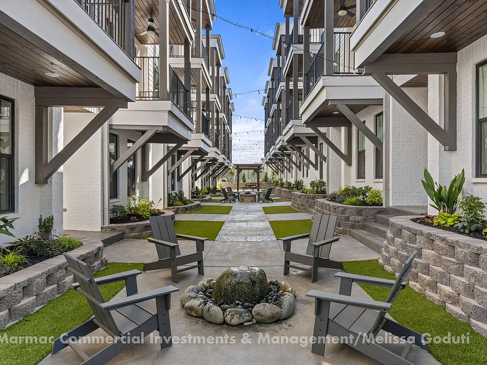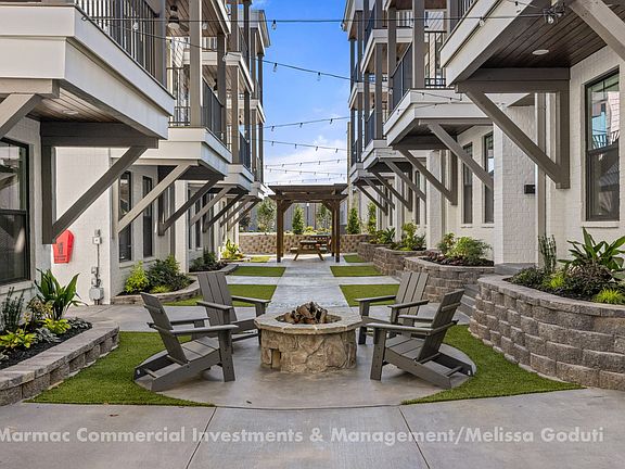 The living room boasts terrace views and opens to a private balcony, while the ground floor provides direct access to the gated courtyard terrace an outdoor space featuring a gas fire pit, water feature, and gazebo with grilling area for residents only.