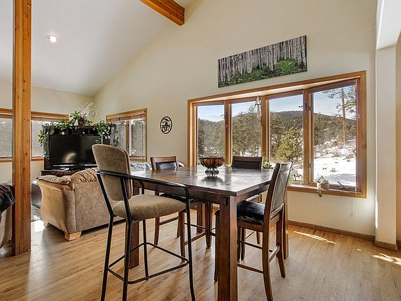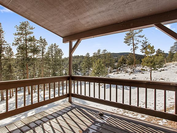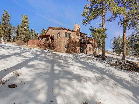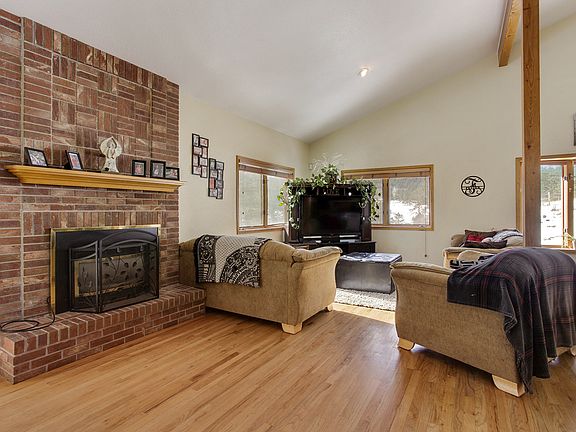 4 beds 1 Office 3 baths 3,483 sq-ft 2.5 Acres Built in 1994 Mill Iron D Estates! Towering ponderosas, a gently sloping plus flat usable land maintained very well. 2 minutes from Highway 285 by the Loaf and Jug. Two Story vaults in the Great Room, 9 foot ceilings in the walkout lower level, one gas fireplace and one freestanding stove, spacious bedrooms, flat entrance and decks around back. Brick exterior, which is awesome protection from snow. The paved driveway enters the heavily insulated over-sized garage that offers direct access to the kitchen through the laundry/mud room, a perfect layout and floor plan for full or part-time living. Beautifully maintained grounds. Needs some inside cosmetic work inside, but think of that as a clean slate to put in your preference of flooring downstairs, and touch up paint or new paint throughout.