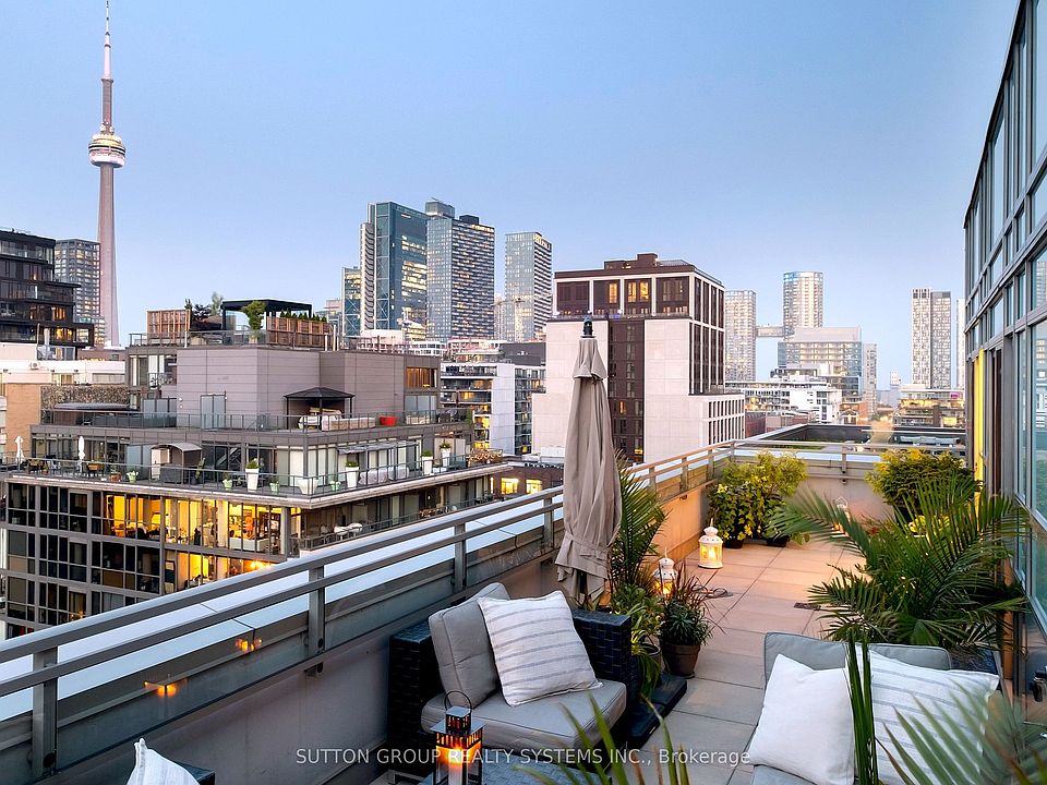Step into this quiet, light-filled, southeast-facing sub-penthouse in a boutique low-rise building ideally located on Portland Street, between vibrant King and Queen West. From the moment you enter, it feels like home. CN Tower and city skyline views are visible from every room. This spacious and functional suite offers over 1,400 sq. ft. of total living space (including the terrace), featuring clean architectural lines and a smart layout. A generous entrance corridor provides privacy and separation from the main living areas. It features 2 bedrooms, 2 full bathrooms, a den/family room, one conveniently located parking spot near the elevator, and a locker. Designed for both entertaining and peaceful living, the open-concept living and dining areas flow seamlessly into the modern kitchen beneath soaring 9 ceilings. The second bedroom offers flexibility as a guest room or office, complete with direct terrace and skyline views. The oversized private terrace is a true standout your own open-air retreat where you can relax, dine, entertain, or work out in total privacy. Rarely found in downtown Toronto, this exclusive outdoor space offers a sense of seclusion that is hard to match. Enjoy the freedom to unwind or host guests without interruption, with the added convenience of power, gas BBQ hookup, and water access .Loblaws is located directly in the building and easily accessed by elevator offering unbeatable everyday convenience. You are steps from top-rated restaurants, cafes, and bars on King and Queen West, the European-style Waterworks Food Hall, YMCA, The Well shopping center, green parks, and the Lake Ontario waterfront. Enjoy effortless access to the Financial District, Eaton Centre, Union Station, Gardiner Expressway, Billy Bishop Airport, and the Toronto Islands. A must-see, especially at twilight to experience the magical city views and lights.