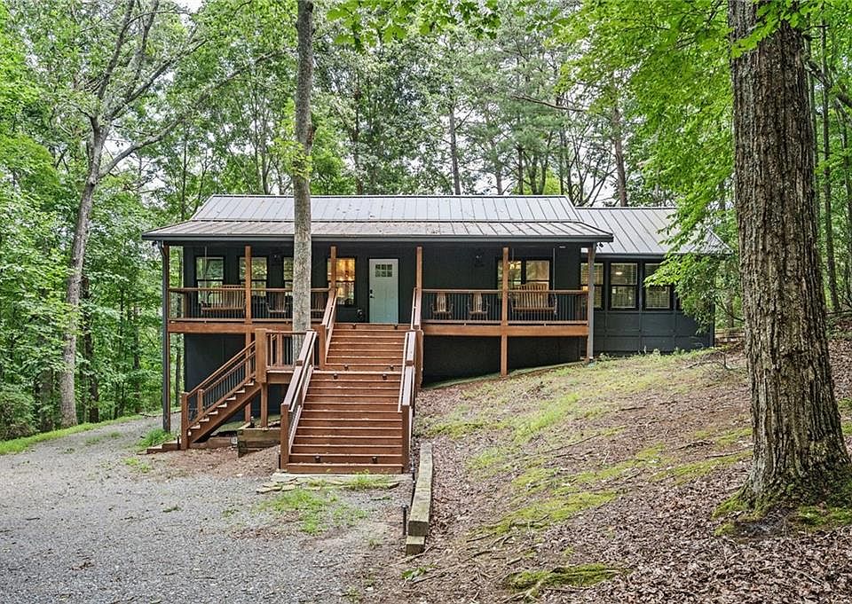 Welcome to the gated community of Walnut Mountain Lakeside. This cozy cabin invites you in with the rocking chair front porch, perfect for enjoying your morning coffee. Step inside to the open floor plan & floor to ceiling windows allowing for tons of natural lighting and scenic views. Primary bedroom is on the mail level along with 2 other bedrooms. Lower level has a media room, living room, bedroom, and full bathroom. Back deck is perfect for entertaining with ample space for seating. Lower patio has more room for seating and a jacuzzi. Enjoy having access to multiple lakes for fishing/kayaking and plenty of hiking trails. This home feels like a vacation year round! Home is being sold fully furnished!!
