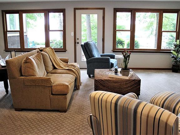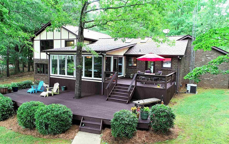 Beautiful hardwood setting for this updated split level home. This home has been updated with three Bedroom suites. The great room has Brazilian Teak floors. The kitchen has been updated with granite counter tops. The den and master bedroom have new gas logs. You have a large sun room with slate flooring overlooking the lake. Two laundry locations with washers and dryers included. The seawall has been repaired and new decking is being installed on the dock. There is an electric boat lift at the max dock. There are beautiful boulders nestled among the trees and beside the circular paved driveway.