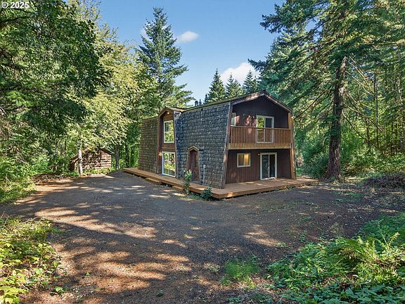 Custom Gambrel Chalet in the Heart of Cascade Locks with Columbia Gorge Views! Nestled on a rare half-acre wooded lot, this one-of-a-kind home is brimming with character, natural light & history. This custom wood home has solid bones, thoughtful craftsmanship & a design that embraces both function & nature. This 2-story residence offers a spacious & inviting layout with very few walls, soaring wood finishes & multiple 8' sliding glass doors that flood the home with sunlight while connecting you seamlessly to the outdoors. The main level features a bright living room with a wood burning fireplace. The kitchen provides ample storage, counter space, built-in-appliances & a nice dining area, perfect for gathering. Convenient flex/bonus room, perfect as an office, and a utility room with washer/dryer hookups and storage. Upstairs has a large family room with a cozy woodstove and 2 bedrooms each with its own private “princess deck”. Recent updates: a newer dishwasher, LVP flooring throughout & exterior decking. Trenches have been installed to manage natural spring water that occasionally pops up on the property. Outdoor living shines with wrap around deck, fruit trees & a forested treehouse vibe, offering both privacy & connection to the unique Cascade Locks community. Parking is plentiful with space for 2+ cars, and the driveway is privately owned. Located just up the hill from the local school & minutes away from the Columbia River Gorge’s endless recreation, downtown Cascade Locks & the famous Bridge of the Gods, this home offers small-town living with convenience. While near Highway 84, the setting provides a true retreat surrounded by towering trees and Gorge charm. Rare opportunity, grab it now!