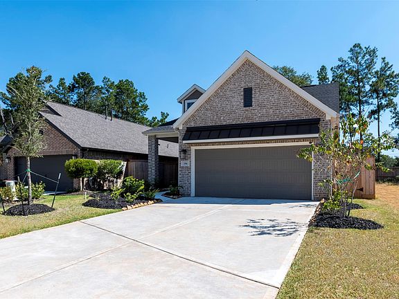 Your private oasis awaits! This 2025 new construction in The Woodlands Hills sits on a peaceful cul-de-sac directly behind is a protected wooded Reserve. No back neighbors and a premium lot offering exceptional backyard privacy. Inside, upgraded luxury tile flows seamlessly throughout—no carpet—for easy maintenance and timeless style. The show-stopping kitchen features upgraded cabinetry, dark hardware, designer backsplash, and pendant lighting. The primary suite rests privately at the back, creating the perfect space for relaxation and privacy. Smart home features include WiFi-enabled garage, fridge, and oven, Arlo doorbell, Eufy touch keypad, and a complete alarm system for secure deliveries and keyless convenience. Enjoy year-round comfort on the extended covered patio. The full sprinkler system and low-maintenance lawn complete this modern, elegant home designed for effortless living and lasting tranquility. Also for lease.