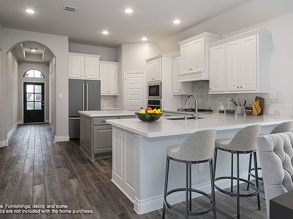 Home office with French doors set at entry with 11-foot ceiling. Open kitchen offers center island, 5-burner gas cooktop and corner walk-in pantry. Dining area opens to spacious family room with wall of windows. Private primary suite includes bedroom with wall of windows. Dual vanity, corner garden tub, separate glass-enclosed shower and large walk-in closet in primary bath. Abundant closet space and natural light throughout. Covered backyard patio. Mud room off two-car garage. Representative Images. Features and specifications may vary by community.