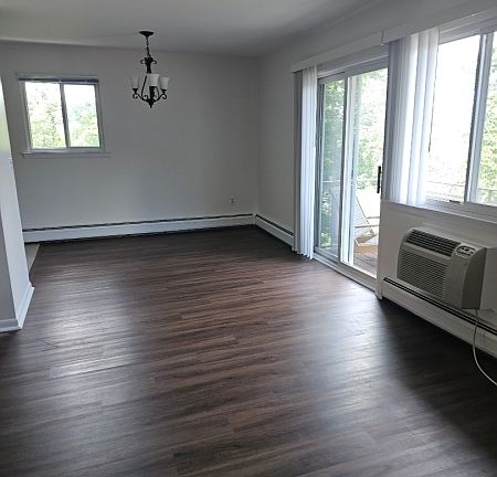 Cheerful 2nd floor corner one-befroom apartment with terrace. A friendly garden-style apartment complex in a very convenient location. Newly renovated bath, luxury vinyl flooring throughtout. The updated kitchen includes a stainless range and refrigerator. Sliding door to private balcony with nice skyline views. Great closet space and efficient cooling unit. Rent includes heat and hot water. Assigned parking for one car plus guest parking. Coin-op laundry in basement plus area services, great shopping, restaurants and transportation. Great value!