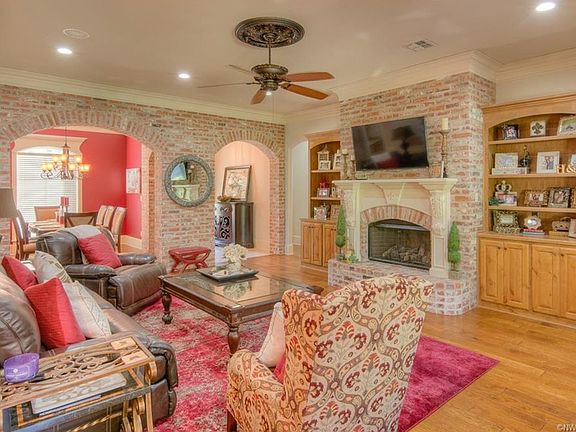 French Quarter & Iron accents! Antique Brick archways. Dark wood blinds throughout. Large kitchen w handmade vent hood, granite counter tops & Island, tumbled marble back splash. Butlers Pantry w/wine rack. Granite in all bathrooms. Living room has built-in shelves & gas log fireplace. Remote Master suite w/dome ceiling & custom walk-in closet. A LOT OF ATTENTION TO DETAIL! Bonus Room upstairs could be 5th bedroom w/ full bath! Corner lot w/3 car garage, Convenient circle driveway. Outdoor entertaining area with pergola & outdoor kitchen!