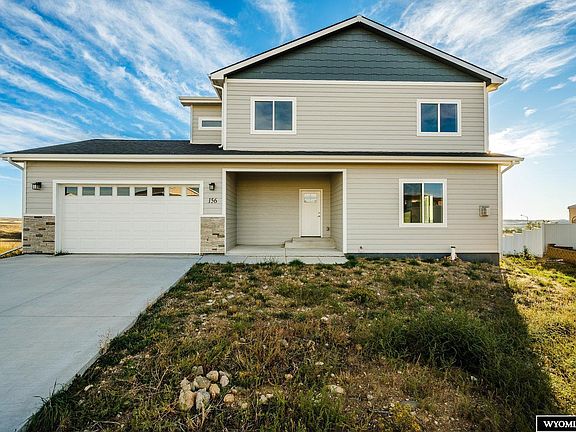 Be the first to own this newly built home in Buffalo Ridge Estates. Located at 156 White Tail Ct., this residence offers the perfect blend of serenity and convenience with sweeping views over French Creek Valley. Set on a spacious city lot, the home features a bright, open layout that maximizes the mountain views. The kitchen is equipped with Samsung appliances, a large pantry, and opens to a Trex deck—ideal for outdoor dining and entertaining. All bedrooms and the laundry room are thoughtfully located on the upper level, providing both comfort and efficiency. The primary suite showcases a generous walk-in closet, double quartz vanity, and a beautifully tiled shower and tub. Additional highlights include an attached two-car garage and efficient forced-air heating. This home is move-in ready and offers the best of modern living in a stunning Wyoming setting