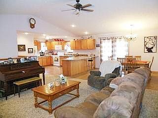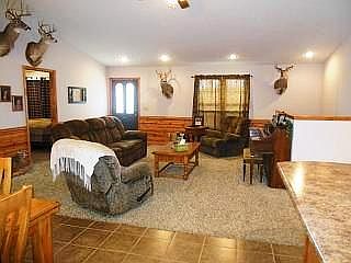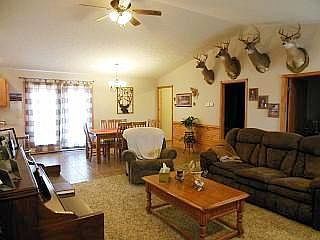 Attractive recently built 5 bedroom ranch on 30 acres. Open floor plan with a 16x17 living room, featuring pine wainscoting. 11x15 dining area and 11x16 kitchen, both with tile floors. Spacious master bedroom. 2nd main floor bedroom. Bath. Oak kitchen cabinets, snack bar, glasstop range. Sliding glass doors off the dining room open onto the 8x30 deck. 8x38 covered front porch. Full-finished basement with 3 bedrooms, bath, a huge 16x32 rec room, an 11x13 family room, plus sliding glass doors to the patio and 24' above ground pool. Thermal windows, 6 ceiling fans, central electric heat as well as an outdoor wood furnace. The land is fenced and cross fenced and about half in grass. Pond, older 14x18 hay barn/loafing shed, 13x14 shop/storage building with electric, 28x28 attached garage. Mobile home hook-up, too. Private setting, yet close to town.