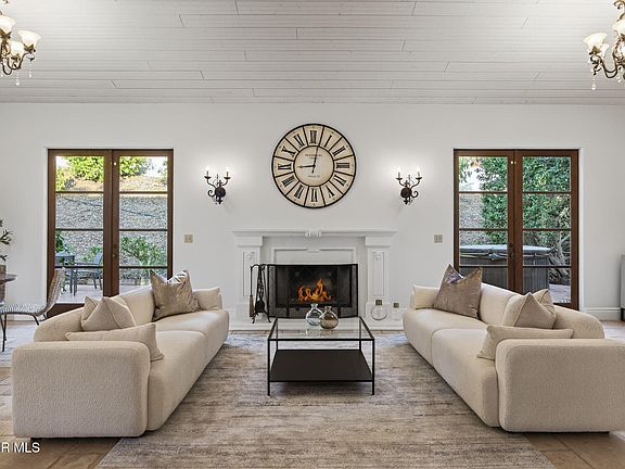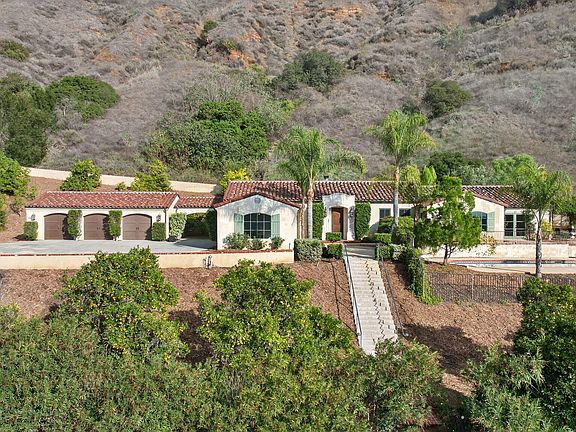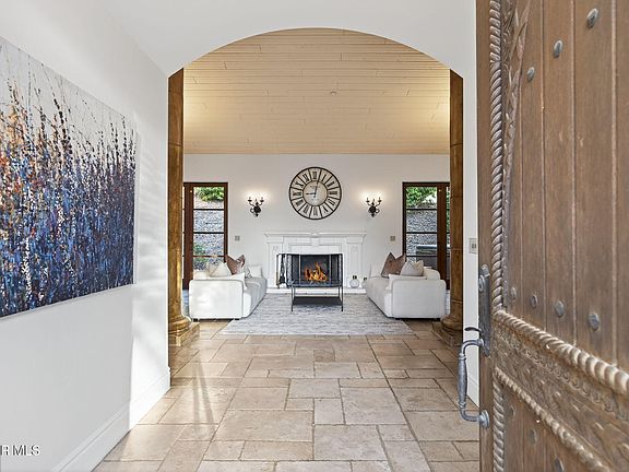 Welcome to this beautifully crafted Mediterranean custom estate set along one of Ventura County's most scenic roads, where rolling hills and the Los Padres Mountains create an unforgettable backdrop. Resting on just over one acre, this private retreat boasts over 4,000 sqft. of estate living with endless possibilities. The main residence features 3,220 sqft., complemented by a separate 860 sqft. guest home designed as a mirror reflection of the main villa's architectural charm. Step through the front courtyard and into a home rich with European ambiance and timeless character. The interiors blend Old-World Mediterranean craftsmanship with thoughtful modern touches - vaulted wood-beamed ceilings, authentic travertine flooring, custom finishes, and tall French patio doors that fill the home with natural light. The formal dining room flows seamlessly into the grand living room which is framed by two soaring pillars, creating an impressive entrance - an ideal setting for intimate dinners or lively gatherings. The kitchen offers both charm and functionality with granite counters, a glass-tile backsplash, Monogram appliances, beautifully built custom cabinetry, and a large walk-in pantry. A few steps down, a cozy family room with wood-like flooring and oversized bay windows takes full advantage of the setting - the sweeping mountain view truly takes center stage in this inviting space. The luxurious primary suite is a sanctuary of its own, featuring vaulted ceilings, a built-in coffee bar with refrigerator, and both a window and French doors that frame the mountain views and open directly to the private pool terrace. The spa-inspired bath includes dual sinks, a soaking tub, an enlarged walk-in tile shower, a separate water closet, a dedicated massage-table area, and a generous walk-in closet. The secondary bedrooms are great-sized, and the indoor laundry room provides exceptional utility with ample cabinetry and a convenient linen sink. Just outside, the estate invites year-round indoor-outdoor living with multiple covered patios, a built-in BBQ, and idyllic spaces for Al fresco dining or enjoying morning coffee overlooking the mountains. The gated pool area is perfectly positioned to capture the views as well, offering a serene, private retreat. The estate includes a 3-car garage, an exceptionally long driveway with room for all the toys, RV parking with hookups, and private parking for the guest house, which also features its own driveway and separate metered utilities - a rare and valuable benefit. Perfectly positioned across the property, the detached 2-bedroom, 1-bath guest home can be used for private quarters for extended family, luxurious guest space, or a desirable income-producing rental, the guest house elevates both the value and function of the compound. The grounds are embraced by mature fruit trees, avocado, orange, lemon, olive, and more, bringing both beauty and bounty throughout the seasons. With additional land and room for additional possibilities such as vineyards or future enhancements, the estate offers space to dream and expand. A true Mediterranean escape - custom crafted with style, surrounded by beauty, and designed to be lived in, loved, and shared.