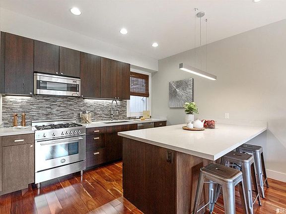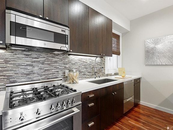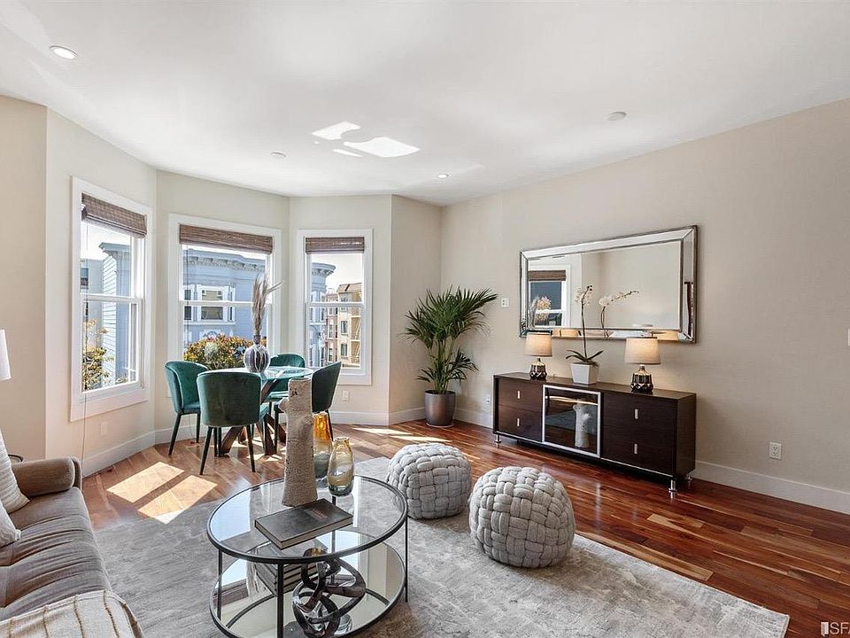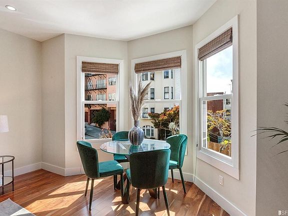 Fantastic 2-bedroom, 2-bathroom in a great location! This home has been thoroughly remodeled with contemporary finishes and features hardwood flooring, high ceilings, and a wonderful open kitchen / great room awash in natural light through a lovely Bay window. The two bedrooms are nicely separated, one in the middle of the unit with access to a hallway bathroom with shower over tub, and the primary bedroom in the rear with a great closet and an ensuite bathroom with walk-in shower and small balcony. In-unit laundry, one parking spot in a secure, shared garage and a fabulous shared view roof deck with unobstructed views of the Golden Gate Bridge, Coit Tower, and Bay Bridge round out the amenities of this great unit.