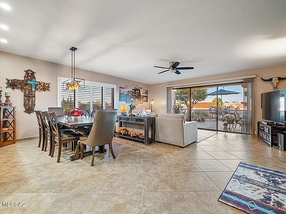 Nestled in the heart of Green Valley's serene desert landscape, this spectacular retirement home presents a perfect fusion of luxury and comfort, tailored for those who seek the tranquil Southern Arizona lifestyle. As you step inside this impeccably renovated residence, you're greeted by a spacious, open-concept design where the living, dining, and kitchen areas flow seamlessly together beneath raised ceilings, creating an inviting atmosphere for relaxation and entertainment. The gourmet kitchen stands as the home's crown jewel, boasting exquisite cabinetry accented with crown moldings, striking granite countertops, and a functional center island that invites social gatherings. The earth-toned tile flooring, laid on the diagonal, infuses warmth and sophistication into the living spaces, perfectly complementing the breathtaking views framed by the triple-pane patio doors that bathe the interior in natural light. Retreat to the generous primary suite, where comfort meets elegance. The ensuite bathroom transforms into a personal sanctuary, showcasing high-end finishes and a custom tile shower that evokes a tranquil spa-like ambiance, perfect for unwinding after a long day. Venture outside to discover the expansive brick patio, which seamlessly extends your living space into the breathtaking outdoors. Here, panoramic vistas stretch as far as the eye can see, allowing you to savor the natural beauty of the desert landscape and ensuring that every moment spent at home feels like a never-ending vacation. You'll also appreciate the oversized garage with ample storage and a nifty workshop/hobby room off the back patio, catering to your creative pursuits! This home is the perfect retreat designed for the discerning retiree eager to embrace the captivating essence of Arizona's enchanting desert