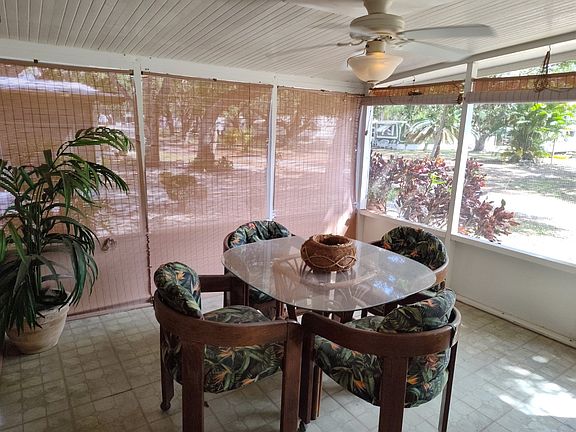 YOUR FISHING CAMP AWAITS ON THE KISSIMMEE RIVER! Spacious FULLY FURNISHED 2-bed 2-bath located in the Kissimmee River Fish Resort, a 55+ community, in Okeechobee, Florida. LOT RENT IS $350 PER MONTH. THIS HOME IS HUGE! 1,203 sq. ft. under air! Boasting a spacious kitchen with beautiful cabinetry, countertops, and tiled backsplash; a large dining area, and a HUGE 33x11 under-air addition!!! A charming 12x12 screened-in lanai with updated French doors is perfect for relaxing in your new Florida abode. The main bedroom boasts an en-suite bath for your comfort. LARGE 12x14 WORKSHOP and a 12x12 INDOOR LAUNDRY ROOM with a double stainless steel commercial sink - catch fish all day and prepare them for your next meal! 2021 AIR CONDITIONER AND DUCT WORK. Plus several ceiling fans throughout keep you cool all year long. The carport is enormous and can easily fit 3 vehicles! This home is situated in an ideal location. The park sits DIRECTLY ON THE KISSIMMEE RIVER and leads right into LAKE OKEECHOBEE! Only 15 minutes from town. Most shopping needs are close by - Publix, Walmart, Home Depot, Marshalls, etc. FORT PIERCE BEACHES ARE JUST 1 HOUR AWAY! Must be park-approved to purchase. No owner financing. Call today to schedule a showing or make an offer. All listing information is deemed reliable but not guaranteed and should be independently verified through personal inspection by appropriate professionals. Our company does not and cannot guarantee or warrant the accuracy of this information or condition of this property. Measurements are approximate. The buyer assumes full responsibility for obtaining all current rates of lot rent, fees, and pass-on costs. Additionally, the buyer is responsible for obtaining all rules, regulations, pet policies, etc., associated with the community, park, or home from the community/park manager. Our company is not responsible for quoting said fees or policies.