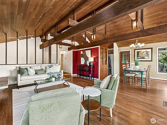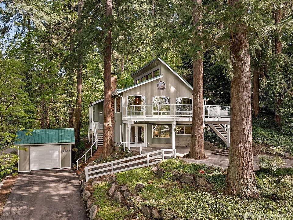 Welcome to this Three Tree Point "Tree House" tucked just off Maplewild Ave. Nestled on a half-acre lot, this custom home offers a classic Northwest setting only blocks from Puget Sound. Upper level features a living area with open-beam vaulted ceilings and a cozy gas fireplace. Step out to the expansive deck, perfect for relaxing or entertaining. Spacious kitchen includes abundant cabinetry & a skylight that fills the space with natural light. Primary suite provides a private bath and tranquil views, creating a true retreat. Lower level offers a separate family room with a wood stove, wet bar, two additional bedrooms, & a full bath with Jacuzzi tub. Don’t miss this opportunity in one of the area’s most sought-after neighborhoods!