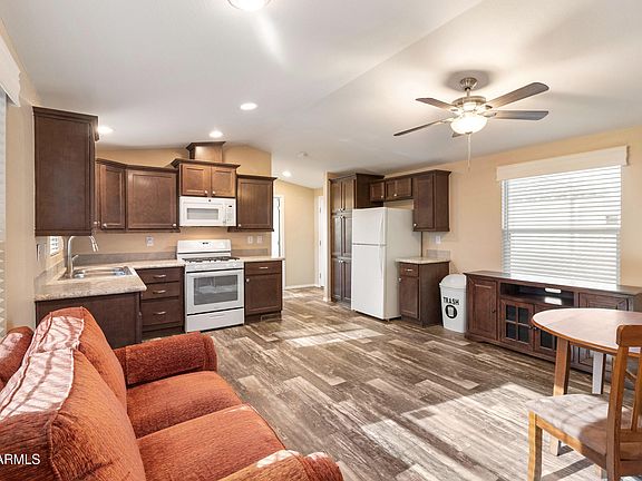 ***PRICE ENHANCEMENT***2020 SPLIT 2 BEDROOM 2 BATHROOM CAVCO, SHOWS LIKE A MODEL HOME, NORTH/SOUTH FACING, VAULTED CEILINGS, OPEN KITCHEN, PANTRY, CANNED LIGHTING, TW0-TONE INTERIOR PAINT, MASTER BATHROOM W/WALK IN SHOWER/BENCHES, 6 PANEL DOORS, WASHER/DRYER INSIDE HAS EXTRA CABINETRY AND SEPARATE LINEN CLOSET, MAIN ENTRY DOOR IS 36''WIDE, T1-11 SIDING, COMP SHINGLE ROOF, SEPERATE SHED OFF COVERED PARKING ON ITS OWN SLAB*LOT RENT $800.00 MO*Hacienda Solano is a 55+ Chandler,mobile home resort near Mesa, Gilbert & Tempe. We're convenient to Highway 202, excellent shopping, movies, restaurants, hospitals, casinos, golf courses and groceries are right across the street! Our Chandler,AZ RV resort has fantastic snowbirding weather, excellent facilities and a welcoming neighborhood of friends.