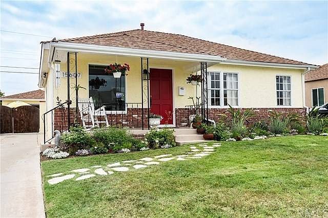 This is the one you've been waiting for! Move right in to this spruced up El Camino Village charmer with fabulous yard and extra-special bonus room off the detached 2-car garage. The flower-filled front yard with stepping-stone path leads to your new front door of this adorable home. Upon entering, you're greeted by the new wood-like flooring which flows through the living room, dining area and updated kitchen. Sleep tight in the good-sized rear bedroom with serene en-suite master bathroom. Two additional bedrooms complete the home. Fun flooring and today's colors featured in the full, hall bathroom. Stainless appliances, quartz counters and white-on-white backsplash make for a delightful kitchen with corner sink and garden window. Pass through the separate laundry room to the lovely backyard featuring patio area for barbecues, room to move in the large grass area, mature avocado tree providing hundreds of buttery specimens, small peach tree, stunning bougainvillea and more. Escape to the tucked away bonus room currently being used as an office. Upgrades include ceiling fans in all bedrooms, newer electrical panel, central heat and whole-house fan for quick and easy cool down. Highly-rated Mark Twain Elementary, nearby Alondra Park and Golf Course and just 5 miles to the Manhattan Beach Pier makes El Camino Village a true gem of a neighborhood.