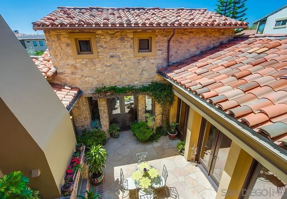 Stone fireplaceBuilt-in media cabinetStriking courtyard patioTuscan architectureMain floor laundry roomTumbled travertine flooringPrivate first floor en-suite