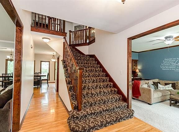 Summer Sizzler!Custom home w/private, treed backyard on a cul-de-sac! Enjoy the incredible view & feeling of vacation every morning from kitchen table.Solid surface counters, island & pantry in the kitchen open to breakfast room that easily holds 12.Large great room w/fireplace, formal living room & half bath complete first floor.Master suite plus spacious secondary bedrooms.Finished walk-out basement w/recreation room, optional bedroom space, office, full bath & patio. Walking trails nearby, shopping & BV Schools!