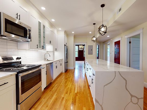 Truly one of a kind! This stunning floor-through home offers an expansive layout with over 2,400 sq. ft. of living space. The completely renovated kitchen boasts quartz countertops, a dramatic ten-foot waterfall island, and sleek stainless steel appliances perfect for both cooking and entertaining.