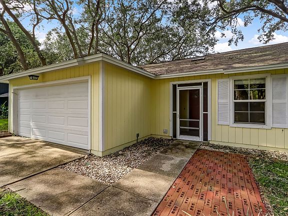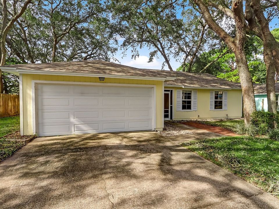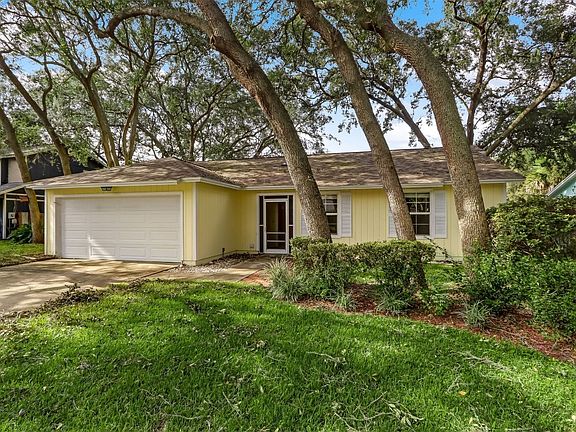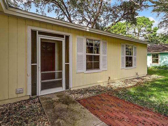 This 3 BR/2BA home features a good size open living room with double doors to the screened back porch, vaulted ceilings, kitchen with plenty of cabinet space, and a separate dining room area. A hallway will lead to the master and two additional bedrooms. The master bath offers a large tiled shower. Travertine flooring throughout the home as well as wood plank ceilings...no carpet or popcorn in this home! Good size fenced backyard with some nice trees and a workshop. A double gate offers the opportunity to store your boat. New roof in 2020, water heater in 2022. Quiet neighborhood near elementary school, shopping etc., and just a few minutes to several beach accesses. Get your showing now and bring your offer!