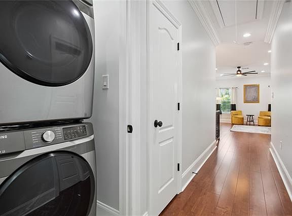 Interior laundryOpen floor planGourmet kitchenStainless steel appliancesQuartz counter topsModern cabinetryHardwood flooring