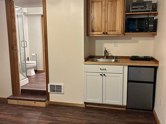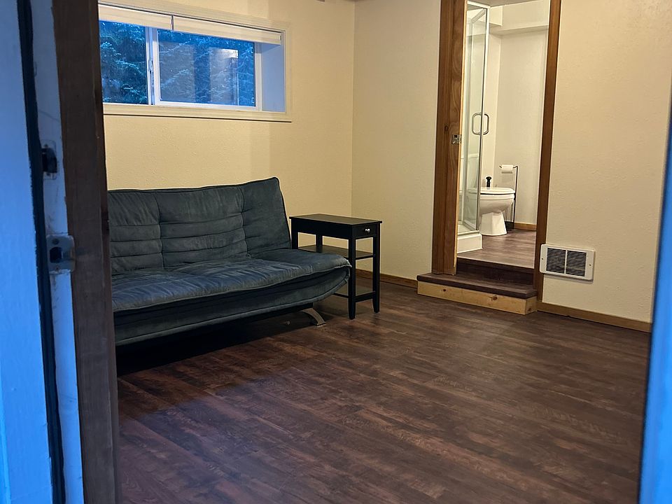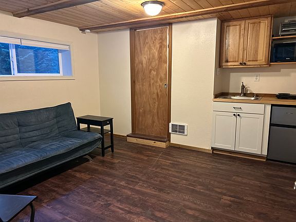 Studio includes a kitchenette, in unit laundry, 3/4 bath, on-site parking (shared with other tenants local to the mountain). Contracted snow removal for driveway (tenant responsible for walkways. doors). Dog-friendly .