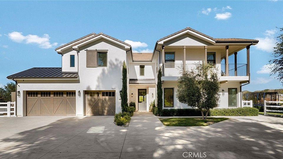 Incredible newer construction Modern Farmhouse estate spanning over 4,500 square feet and set on over 54,000 square feet of land. This 5 bedroom, 5 bathroom home is located in desirable Sand Canyon and was custom built with privacy, stunning views and high design in mind. Drive up the long private driveway set back from the street and you are immediately swept away by the greenery and immaculate exterior. Walk through the generous entry and you are captivated by the soaring wood beamed ceilings, massive open floor plan, and large scale windows and sliding glass accordion doors. The gourmet chef's kitchen with stainless steel appliances, custom cabinetry and oversized center island with seating is open to the sumptuous dining room, butler's pantry and living room with fireplace with spectacular views from every angle. Upstairs is the romantic primary suite with huge balcony showcasing the views and sliding barn door leading to the spa-like primary bathroom with two large vanities, makeup counter and huge walk-in closet. Three other generous secondary bedrooms upstairs all perfectly designed with large closets and clean architectural lines. There is also a generous bonus room used as an upstairs family room which open to the spacious balcony. Downstairs also has a considerable bedroom and bathroom suite. The entertainer's yard has jetliner views, a covered patio perfect for lounging and dining, and dreamy sprawling grass areas. This home is stunning and is a jaw dropper from the moment you step onto the property. Bonus features include: custom wine closet with showcasing glass door, wire brushed French Oak wood floors, dedicated electrical line built in garage for possible use of solar panels and electric vehicles if desired to be installed in future and 3-car garage. Be prepared to fall in love at first sight. Near Sand Canyon Golf Course and Placerita Canyon and hiking trails.