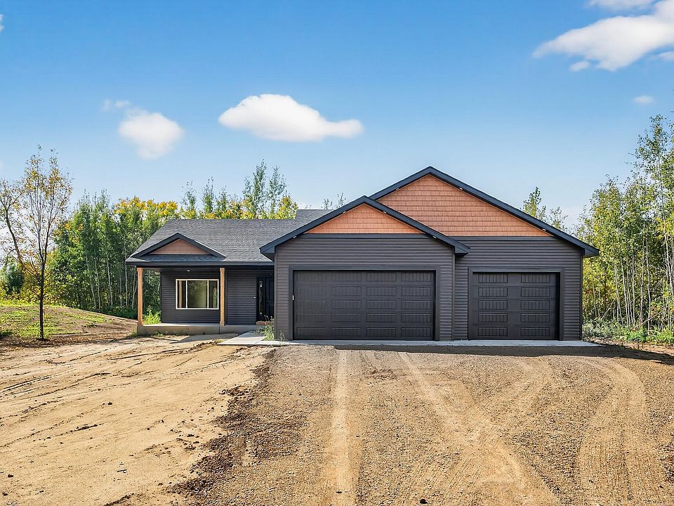 Welcome home to your private 2.95-acre fully wooded lot! This charming residence boasts 1,382 finished sqft, featuring an open main floor, 3 bedrooms, and 2 bathrooms. Enjoy beautiful knotty alder trim, solid panel doors, and custom cabinetry throughout the home, complemented by elegant Quartz countertops. The insulated and sheetrocked garage adds convenience, while Thermo Tech windows enhance energy efficiency. Relax in your serene backyard oasis!