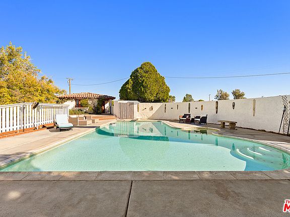 One of Desert Knolls' earliest architectural estates, this 1948 adobe ranch was designed by noted Southern California architect John Byers, whose work helped define early California and Spanish-Revival residential design. Built with 12-inch handmade adobe block and classic Byers detailing, the home carries an authenticity and craftsmanship rarely found today. Signature elements include open-beam ceilings, extensive built-ins, hardwood floors, and a dramatic floor-to-ceiling fireplace constructed from salvaged Tehachapi earthquake brick.The single-level layout spans over 3,000 sq ft with a large great room, formal dining room, breakfast nook, family room with fireplace, and a finished basement with wet bar ideal for hobby, creative, or entertainment use. Updates complement the home's architectural integrity, including refreshed flooring, upgraded kitchen surfaces and appliances, improved paint, and enhanced bath fixtures.Set on a private 1.85-acre lot with mature trees, a detached garage, gated parking, pool and spa, a separate casita with its own bath, and paid-off solar for energy efficiency. A rare chance to own an authentic John Byers adobe estate with land, character, and architectural pedigree.