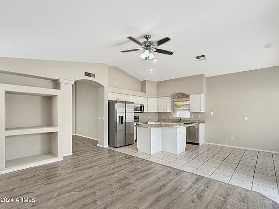 Discover this inviting 3 bed, 2 bath single-story home in Goodyear. Featuring an separate living room and an open family room/kitchen/dining room with hard flooring throughout. The kitchen boasts modern updates including white cabinets, granite countertops, and stainless steel appliances. The master bedroom offers direct access to the backyard via a sliding door. The spacious backyard presents a blank canvas for your personalization. With no HOA fees this home is just waiting to be called YOURS!