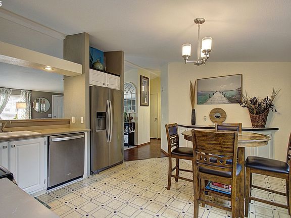 Adorable Move in Ready Home featuring 1,188sf, 3 Bedrooms with 2 Full Bathrooms. High Vaulted Ceilings full of light and bright throughout. Kitchen provides Stainless Appliances, plus a Dining Area. Primary Bedroom features walk-in closet, walk-in shower and Linen Closet. Two additional Bedrooms plus Full Bathroom opposite Primary. Laundry Area located off Kitchen with Washer/Dryer included. Backyard is a Private Retreat with Trees. NEW: Roof and Exterior Paint. Tool shed included. Long Driveway for parking. Best Lot location. Family Friendly Park!