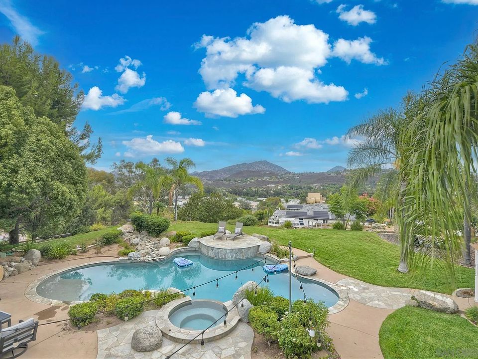 SIX Garages! One is a Large RV garage. Custom home on private 1-acre lot in Poway w/stunning views of Mt. Woodson! Beautifully updated 4,949 SqFt home offers 4bdrm, 4ba, & exceptional indoor-outdoor living. Resort-style backyard with pool/spa, firepit and built-in BBQ. Chef’s kitchen features high-end Viking appliances. Upstairs primary suite boasts newly remodeled bathroom, walk-in closet, & private balcony. Huge bonus: oversized 3 bay, detached RV garage fits a 34’ motorhome PLUS attached 3-car garage. Owned solar No HOA or Mello Roos. PUSD Spectacular custom home on a private 1-acre lot in Poway with breathtaking Mt. Woodson views! This beautifully updated 4,949 SqFt residence features 4 beds, 4 baths, and seamless indoor-outdoor living. The resort-style backyard includes a pool/spa, enlarged firepit, built-in BBQ, and drought-tolerant landscaping. Inside, enjoy a chef’s kitchen with Viking appliances, expansive great room with panoramic windows, and a luxurious upstairs primary suite with remodeled bath, walk-in closet, and private balcony. Thoughtful upgrades include full copper repipe, new furnace, tankless water heater, updated fascia, and more. Additional highlights: central vacuum, solid wood doors, remote blinds, abundant storage, and owned solar. RV enthusiasts will love the oversized detached garage—fits 34’ motorhome, boat, and toys—plus an attached 3-car garage. All within the award-winning Poway Unified School District. A rare, turnkey retreat—this one has it all!