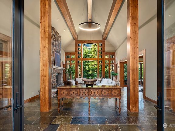 Luxury Northwest Lodge in the famed Uplands Reserve community. Privacy & tranquility prevail on 4.23 acres with a breathtaking mountain backdrop. Incredible gathering spaces & luxe craftsmanship throughout. A soaring great room boasts rich wood details, floor-to-ceiling fireplace & spectacular views. The chef’s kitchen is ready for preparing holiday feasts w/top-notch appliances, dual islands & butler's pantry. Desirable floor plan w/office & primary suite on the main; 3 bedrooms + bonus up. 500-bottle wine cellar + theatre. Fabulous year-round outdoor living including built-in grill & firepit. Oversized 5-car garage w/heated floors, shop area & 2 Tesla chargers. Charming amenities minutes away + close proximity to the Eastside & Seattle.