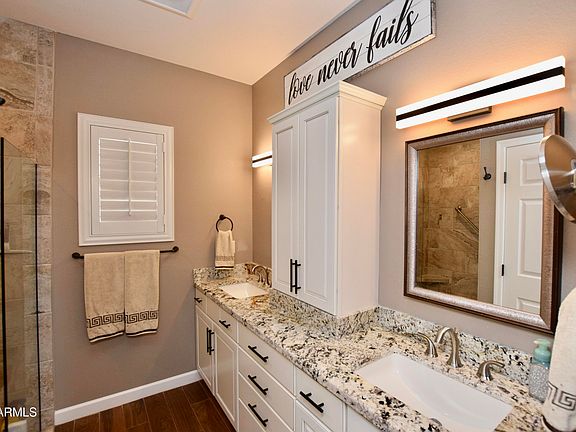 RARE OPPORTUNITY 3 BED 3 BATH WITH DUAL PRIMARY SUITES. Gorgeous primary suite permitted addition to the property creating a very spacious room, multiple closets & a fantastic primary bathroom with a large shower. The original primary also features a large bathroom and shower making two of the three bedrooms en-suite. THIS MOVE-IN READY home is updated and features an open floor plan, granite countertops, plantation shutters, and more. RESORT STYLE PRIVATE BACKYARD with no immediate neighbors behind the house with golf a few blocks away. Enjoy heated spa, mature lemon tree & beautiful pineapple palm. 4 championship golf courses, 5 swimming pools, pickleball, tennis, 2 great fitness centers, softball field, over 40 exciting special activities clubs, great restaurants, and more. ACT QUICK!
