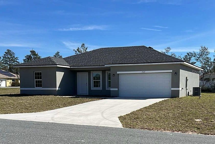 One or more photo(s) has been virtually staged. Brand new 100% complete construction home in Marion Oaks, offering immediate occupancy. Located in the thriving Marion Oaks community between The Villages and Ocala, this modern residence sits on a spacious 1/3 acre lot. Featuring a contemporary exterior with vibrant colors, the home boasts a large great room perfect for gatherings, adorned with modern grey tile throughout (no carpet). The kitchen showcases espresso cabinetry, stainless appliances, granite countertops, and a spacious island with bar seating. The master bedroom is generously sized with a walk-in closet and a stylishly designed bathroom featuring dual vanities and an elegantly tiled shower. Guest bedrooms and bathroom continue the modern aesthetic. Abundant windows, including sliding doors, flood the interior with natural light, leading to the expansive backyard. Enjoy the convenience of proximity to golf courses and I-75. Move in today and embrace the comfort of this thoughtfully designed home.